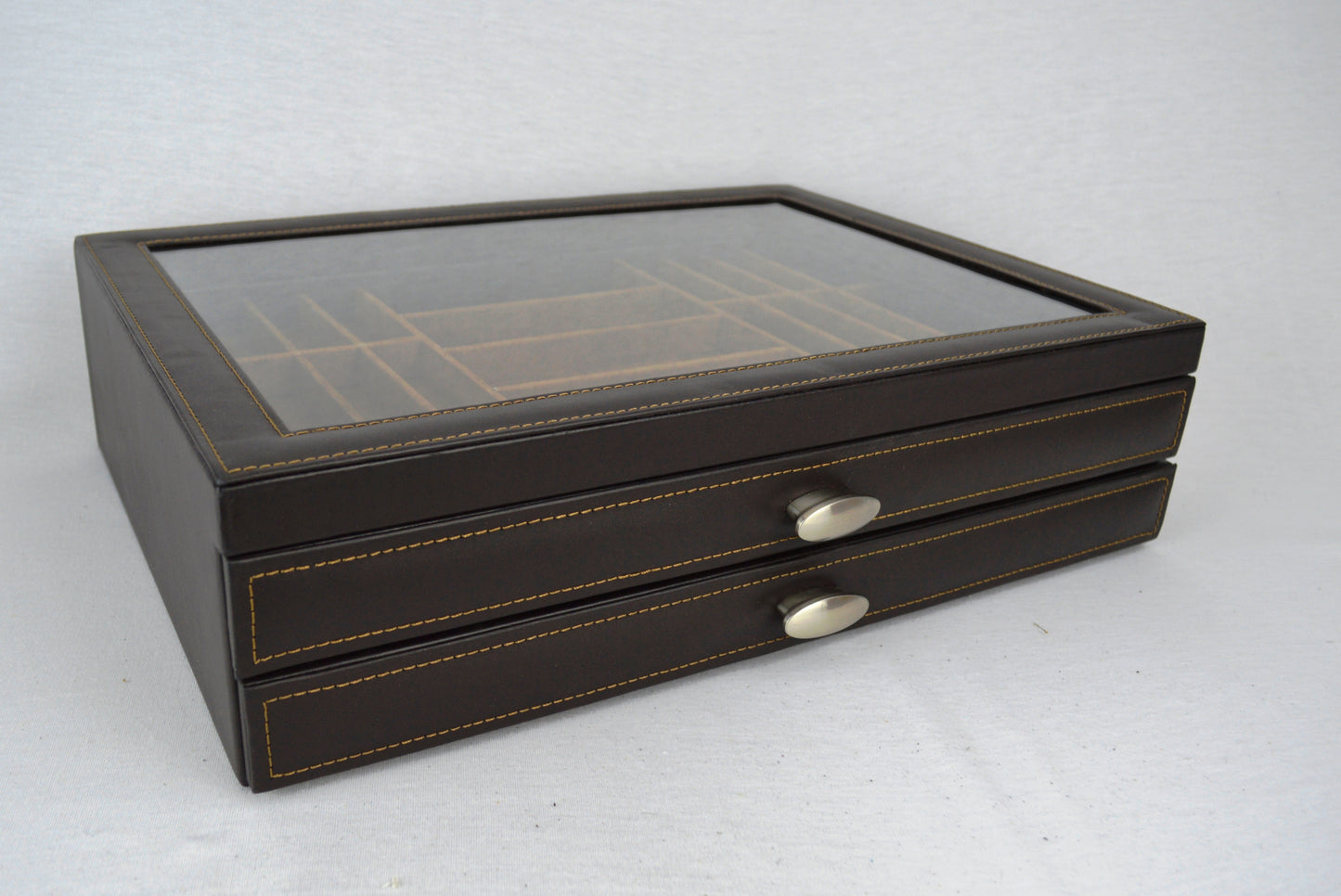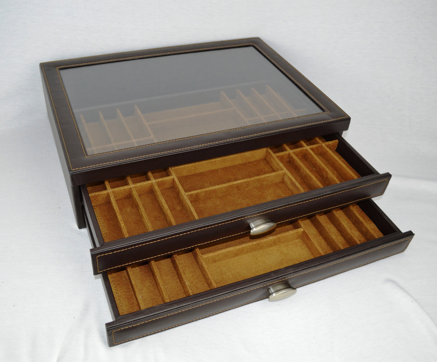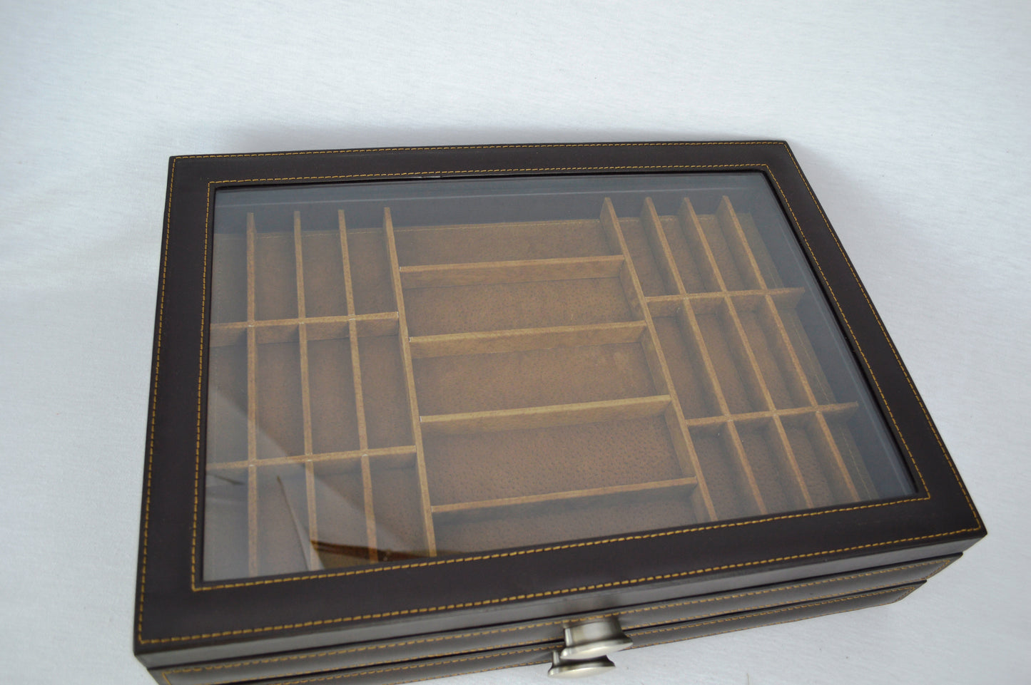 Estructurado en caja de madera, artículo forrado en su totalidad en piel genuina de piel vacuno en el exterior, el forro del interior es piel porcino, la tapadera es de cristal.