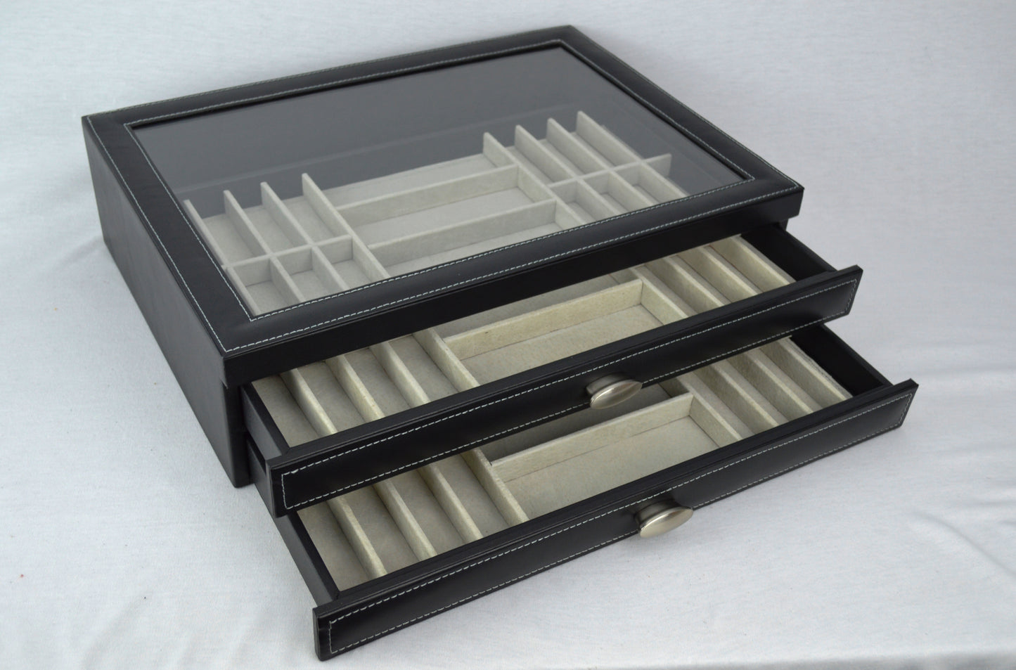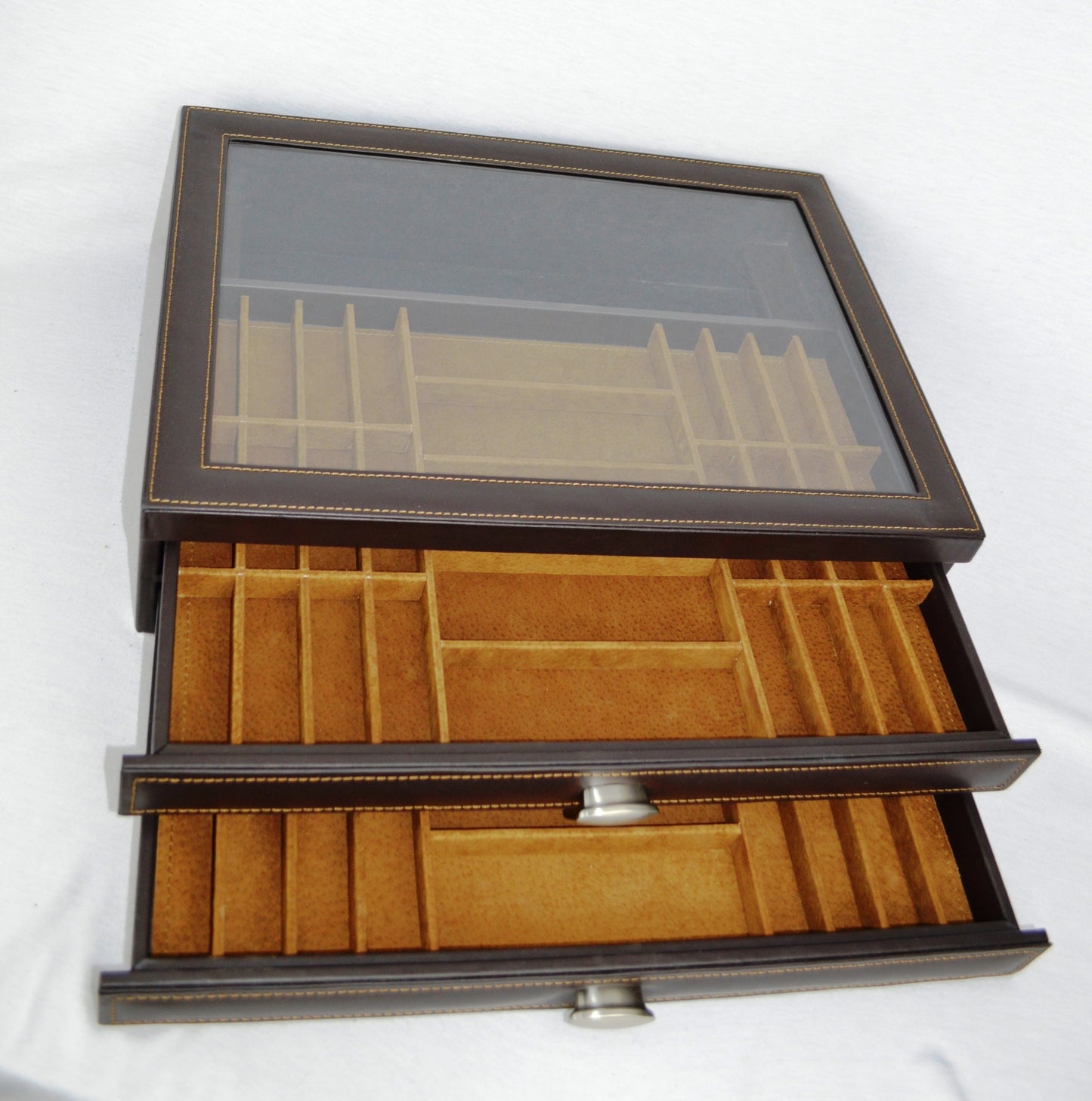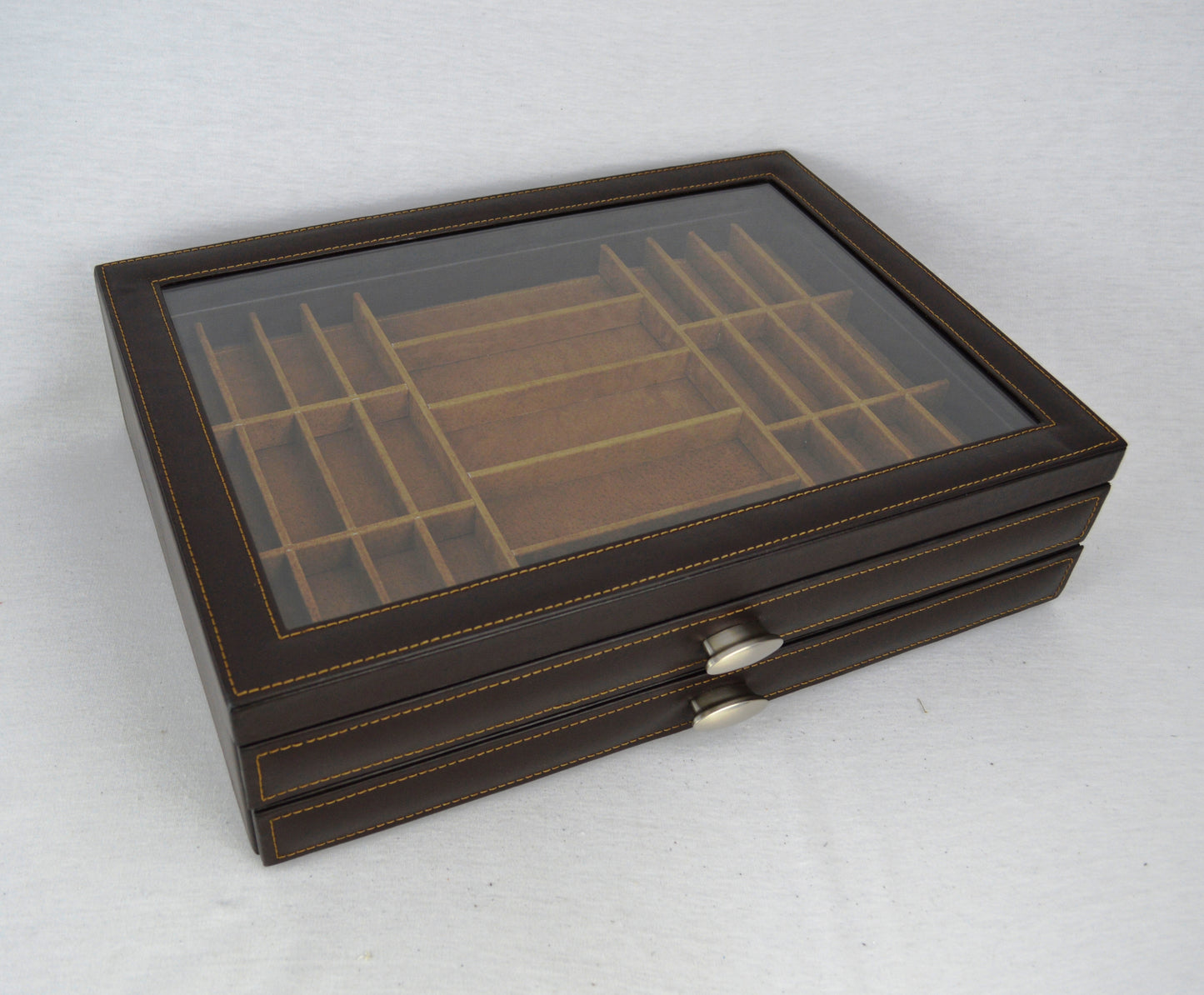 Estructurado en caja de madera, artículo forrado en su totalidad en piel genuina de piel vacuno en el exterior, el forro del interior es piel porcino, la tapadera es de cristal.